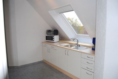 Unsere Küche ist wie folgt ausgestattet: Mikrowelle, Backofen, Kaffeemaschine, Eierkocher und Geschirr.
